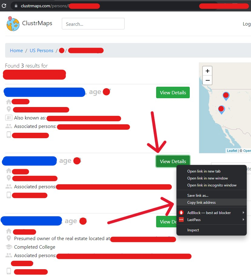 Locate the record you want to be suppressed on the results page. Once found, right-click the respective "View Details" button to the right. Select the "copy" option from the cursor menu, this URL can be "pasted" into other places. The proper URL will have similar formatting to: clustrmaps.com/person/LastName-IDNumbers. If the copied link does not have this format, close the browser completely and restart the process.