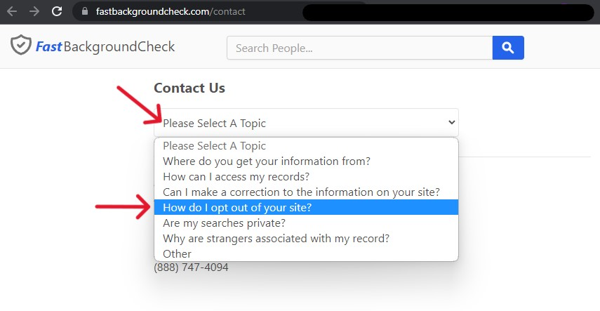 Consumers opting out multiple records or details involving minors or having problems with the form should "email" FastBackgroundCheck's team. The user must use the short form on their Contact Us page to do this. The process below offers how to obtain and fill in the requested details, starting with obtaining an applicable URL. The necessary URL is attached to the consumer's specific profile.